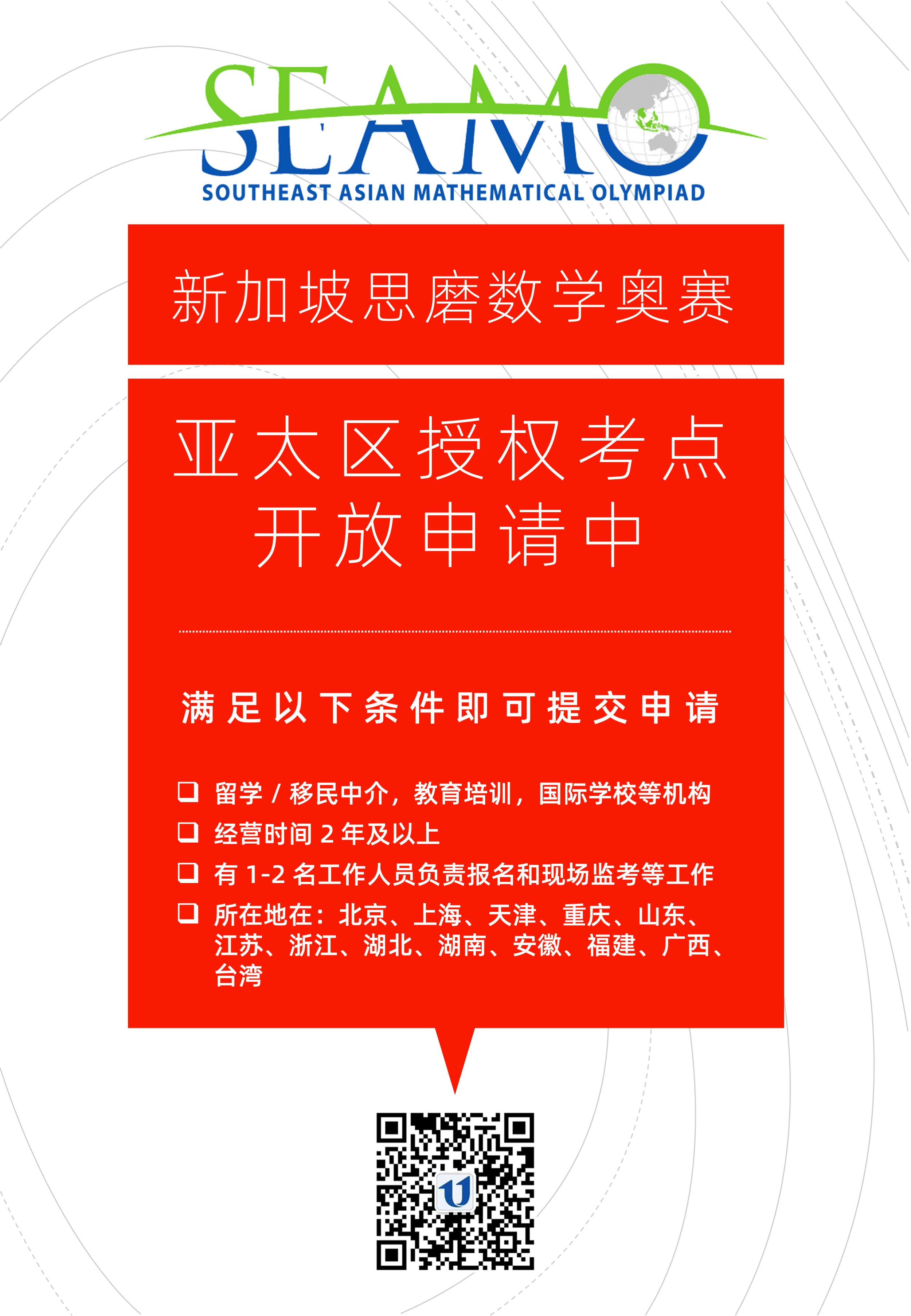 我们正在面向大中华区域的以下省/市/自治区开放 SEAMO 授权考点(Testing Centre)申请: